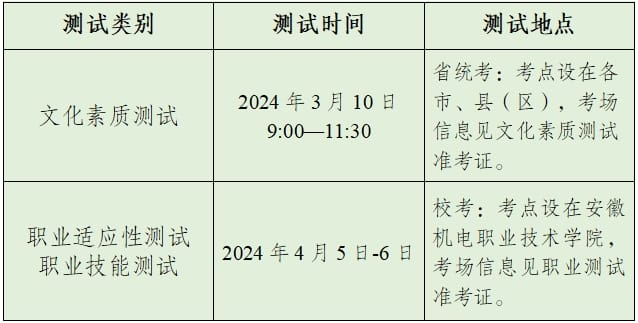 所有考生均须参加省教育招生考试院统一组织的文化素质测试。文化素质测试内容参照《安徽省普通高校分类考试招生和对口招生文化素质测试考试纲要》执行,测试包括语文、数学、英语三科内容。卷面分值为300分,其中语文、数学120分,英语60分。采取合卷笔试的方式进行考试。
